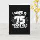 Este desenho engraçado de aniversário de 75 anos faz uma piada de humor sarcástico ótima ou presente de novidade para um tema de aniversário de 75 anos ou festa surpresa de 75 anos! Apresenta o meme engraçado de aniversário de 75 anos "Eu consegui chegar aos 75 anos... Nada me assusta" que vai fazer muitas risadas da família, amigos, convidados da festa e do aniversariante também!