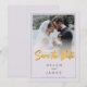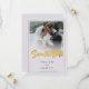 Capture a essência do seu amor com este lindo cartão de foto de casal Save the Date. Perfeito para anunciar a data do seu casamento, este cartão personalizável apresenta sua foto favorita e foi projetado para causar uma impressão duradoura. Personalize os detalhes e deixe seus entes queridos saberem a notícia emocionante com estilo. Uma maneira linda de compartilhar seu momento especial e garantir que seus convidados marquem suas agendas para o grande dia. Ideal para casais que procuram uma maneira única e emocionante de iniciar a celebração do casamento.