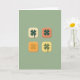 This card features four clover icons set inside rounded squares, arranged in a neat two-by-two grid on a muted sage-green background 💚. Each square feels like a small keepsake, sitting evenly spaced as if they’re close friends gathered side by side. The palette mixes soft cream, warm terracotta, gentle ochre, and pale lemon yellow, with clovers in deep forest green and one in ochre for a cozy, grounded look ☘️. A light shadow under each rounded square adds a touch of depth, like the shapes are resting just above the surface. Two clovers (top-right and bottom-left) are simple, stemless silhouettes, while the top-left and bottom-right clovers include a slim stem that leans gently, like a quiet nod between companions. There’s no main message text on the front, leaving the centered grid to do all the talking with color and shape. The four rounded squares—cream, terracotta, warm orange, and pale yellow—each hold a clover in dark green or ochre, aligned centrally against the calm sage field.