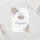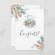 Placa de parabéns. Projetado com uma ilustração criada com aquarelas. Um coelhinho de mamã giro vestido de azul sentado em uma cesta cercada por ovos. Borboletas e flores à volta da cesta. Tulip buquês florais nos cantos.