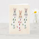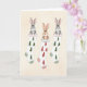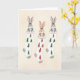 Este cartão de Natal apresenta um retrato aquoso de coelhos bonitos sentados em meias de Natal contra um fundo bege.