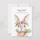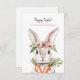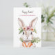 Bonito coelho da Páscoa com cartão de cenoura. Maravilhosas primavera cores em cor rosa pastel, laranja e acastanhada, design floral de cor d'água, e um belo coelho bonito com duas cenouras laranja. Texto personalizado com um belo roteiro de tendências.
