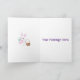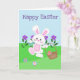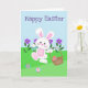Este adorável Coelho da Páscoa está coletando ovos coloridos da Páscoa para colocar em sua cesta de vime marrom. O fundo apresenta um céu azul e gramado verde, com delicadas flores roxas. Dentro, o painel esquerdo tem uma pequena imagem do Coelho da Páscoa e sua cesta. O painel direito tem uma caixa de texto que você pode personalizar com sua própria mensagem.