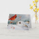 "White Inverno Conhece Vermelho Regal" Cartão de Saudação de Arte por Aquarela do artista Jean Weiner "White Inverno Conhece Vermelho Regal" apresenta um Coelho Snowshoe um Cardeal Norte masculino saudando-se um ao outro ao amanhecer. O coelho está aninhado num cobertor de neve grosso, branco. A ave cardinal está empoleirada num galho com bagas vermelhas. Árvores verdes profundas estão distantes. Estes dois parecem ser amigos rápidos! Que aventuras estão guardadas para eles hoje? Certamente para iluminar o dia de qualquer amante da natureza!