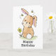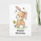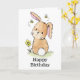 Coelho castanho bonito e adorável, com uma cauda branca e lisa, sentado ao lado de uma flor amarela, e abelhões a zunir-se à volta da cabeça. Arte original em tintas aquáticas. Abaixo e dentro são modelos para adicionar suas próprias mensagens.