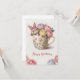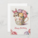 Um cartão de aniversário com uma ilustração alegre em estilo aquarela de um coelhinho com um laço rosa brilhante espiando de dentro de uma xícara de café de cerâmica e rosas delicadas em cores pastéis.