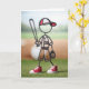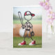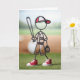 Um personagem de boné vestido como um jogador de beisebol se posiciona na grama verde de um campo de beisebol segurando um taco e uma luva para o aniversário do beisebol. Todo o texto pode ser alterado.