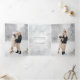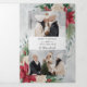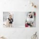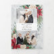 Este design clássico e tradicional apresenta dois modelos de fotos com elemento de vazio central para sua personalização em um plano de fundo de poinsetos estilo aquarela, rosas brancas e pino em um fundo de cinza névoa. Os painéis apresentam três modelos adicionais de fotos, bem como campos de texto editáveis em um plano de fundo de cor d'água de cinza complementar.