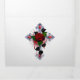 Cruz de prata com uma rosa vermelha e folhas pretas em um fundo branco.
