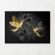 Joias pretas e douradas, beija-flores, sobre fundo de cinza decorado com plantas. Pássaros joalharia. Pássaro ouro. Pássaro Dourado.