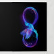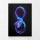 Símbolo luminoso, roxo e infinito com beija-flor azul voadora, luminosa, em fundo preto. Neon.