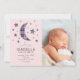 Cartão de anúncio de nascimento bonito com as suas próprias fotos de bebê. A carta apresenta as formas de lua e estrelas cheias de bonito padrão de xadrez. Perfeito para uma foto de bebê dormindo. Sob a Lua e as estrelas é onde você pode adicionar os nomes do seu bebê e as estatísticas de natalidade. Uma segunda imagem pode ser adicionada à parte traseira do cartão juntamente com os nomes dos pais.