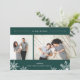 O cartão com fotos elegante e moderno apresenta duas fotos favoritas alinhadas lado a lado, com "tão feliz" no topo em itálico branco e tipografia de blocos em um fundo verde caçador. Personalize com sua saudação personalizada e seu nome na parte inferior, acentuado por quatro ilustrações brancas do floco de neve. A placa se reverte para um padrão de queda de neve em branco sobre preto.