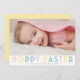 Este cartão com fotos bonito, porém moderno, apresenta uma fotografia horizontal solteiro com tipografia colorida pastel. O backer é uma faixa diagonal amarela e branca para coordenar com a cor do tipo. Todas as cores neste design são personalizáveis, incluindo cores de saudação e backer.