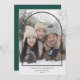 Este cartão com fotos de Natal moderno apresenta uma grande foto e uma simples cobertura de arco preto. O arco é centrado em uma foto de cheio que é orientada verticalmente. Personalize com a sua foto favorita da família, uma saudação de Natal personalizada, e os seus nomes e o ano no fundo. Na parte traseira do cartão, você encontrará espaço para mais fotos e/ou uma mensagem personalizada, se desejar. A cor verde da floresta escura no fundo pode ser alterada.
