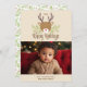 Uma bela rena rústica com louros de férias e texto "Feliz Feriados". Clique em "personalizar este modelo" para editar os campos de texto com o ano e os seus nomes, juntamente com a alteração da foto para a sua. A cor de fundo pode ser alterada. Volta: Correspondendo o padrão de sagrado e bagas. © Kimbellish, LLC