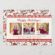 Um clássico padrão floral tradicional de inverno de poinsetos vermelhos, bagas e verde, com uma borda vermelha de gingham, faz o fundo deste cartão que apresenta 3 fotos na frente, com espaço para sua escolha de saudação principal, mais uma linha de saudação de segundo e uma linha de nomes, data ou citação favorita. O apresenta o mesmo padrão floral com espaço para 5 fotos e uma linha de texto ou uma data.