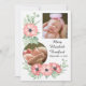 Personalize este cartão de aviso de nascimento adicionando o(s) nome(s) do bebê, a data de nascimento e duas fotos. Vá para a Ferramenta Design para carregar suas fotos e, em seguida, redimensione e posicione as imagens atrás do quadro principal. O cartão apresenta flores cor-de-água rosa e verde.