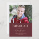 Este cartão com fotos de graduação moderno apresenta uma simples tipografia e uma grande foto. Uma foto horizontal do formando está no topo, com a palavra "Formando" escrita em letra maiúscula de tendência abaixo. Por baixo da tipografia, adicione o nome do formando na caligrafia, com a escola e o ano de graduação no fundo do cartão. A tipografia é creme contra um fundo de burgundy. A parte traseira da placa de graduação inclui um modelo opcional para adicionar detalhes da festa de formatura.