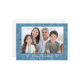 Um cartão com fotos de na moda para Chanucá com borda de padrão geométrico azul e menorras brancas com texto feliz de Chanucá. Adicione sua foto favorita e sentimentos adicionais nas costas para uma saudação especial a Hanukkah.