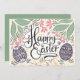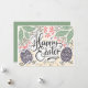 Cartão com fotos pastel colorido. Script de felz pascoa enquadrado com folhas, flores e ovos em cores bonito verdes, amarelas, cor-de-rosa e roxas. A parte traseira da placa apresenta o modelo de foto do solteiro e a linha de texto para nome e ano com a coordenação do plano de fundo de cor verde do sábado.