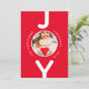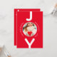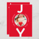 Um simples cartão de Natal minimalista, em vermelho e branco. Na frente: Um fundo vermelho clássico, com a palavra JOY escrita com letras brancas em negrito. A letra O é usada como quadro fotográfico. Personalize e adicione sua própria foto da família, nome e ano. Fundo: fundo vermelho e texto branco. Adicione seus próprios cartões de natal e nomes de família. As letras da palavra JOY como decoração.