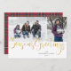Dourado Script "Saudações da Época" em falso brilho com padrão vermelho de tartan, 2 cartão de saudação de fotos.