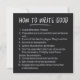 A design do escritor "Como Escrever Bem" é um design de texto simples com uma lista de dez engraçados, brincados com palavras, regras a serem seguidas quando escrevendo. Este design de escritor simples, mas hilário, faz um belo presente para professores, escritores, romancistas, jornalistas e qualquer outra pessoa que escreva ou ensine inglês para viver.