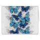 Composição vertical de borboletas de morfo realistas, azuis e brancas sobre fundo texturizado de cinzas. Borboleta azul Morpho.