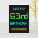 Este simples e divertido design de cartões de aniversário apresenta uma mensagem como "FELIZ 63º ANIVERSÁRIO, RICCARDO!". Seu olhar é inspirado pelo campo da computação digital. O nome na frente e a mensagem no dentro podem ser personalizados. Ele poderia ser enviado ou dado a alguém que comemora seu sexagésimo terceiro aniversário, e que talvez trabalhe (ou trabalhou antes da aposentadoria) como administrador de sistema de computador, programador de computador, administrador de rede, engenheiro elétrico, desenvolvedor de software ou que, de outra forma, gosta de usar computadores. [~Z0000100]
