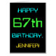 Este simples e divertido design de cartões de aniversário apresenta uma mensagem como "FELIZ 67º ANIVERSÁRIO, JENNIFER!". Sua aparência é inspirada no campo da computação digital. O nome na frente e a mensagem no dentro podem ser personalizados. Ele poderia ser enviado ou dado a alguém que comemora seu sexagésimo sétimo aniversário e que talvez trabalhe (ou trabalhou antes da aposentadoria) como administrador de sistema de computador, programador de computador, administrador de rede, engenheiro elétrico, desenvolvedor de software ou que, de outra forma, gosta de usar computadores. [~Z0000100]