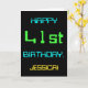 Este simples e divertido design de cartões de aniversário apresenta uma mensagem como "FELIZ 41ruas ANIVERSÁRIO, JESSICA!". Seu olhar é inspirado pelo campo da computação digital. O nome na frente e a mensagem no dentro podem ser personalizados. Ele poderia ser enviado ou dado a alguém que comemora seus quarenta anos, e que talvez trabalhe (ou trabalhou antes da aposentadoria) como administrador de sistema de computador, programador de computador, administrador de rede, engenheiro elétrico, desenvolvedor de software ou que, de outra forma, gosta de usar computadores. [~Z0000100]