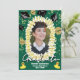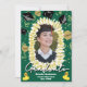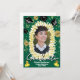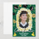 Celebre seu graduado de uma maneira divertida e exclusivamente havaiana com este cartão de foto de formatura brilhante e alegre! O design apresenta um fundo azul real ousado espalhado por bonés de formatura, confetes ondulados e balões "Parabéns!" divertidos para uma atmosfera festiva. Uma bela moldura de lei em estilo plumeria amarelo envolve a foto do graduado, adicionando um toque caloroso inspirado na ilha.