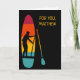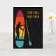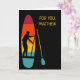 Crie um cartão personalizado para aniversários ou qualquer ocasião. Este cartão de saudação é perfeito para os carregadores de remo. Apresenta uma ilustração de um SUP ou conselho de remo e remo rebatíveis em cores vibrantes do pôr do sol com uma ilustração da silhueta a preto de um remo. O gráfico é colocado sobre um fundo preto. Há um ponto para adicionar sua própria mensagem na frente e na dentro deste cartão.