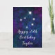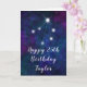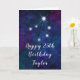 Este cartão de aniversário cósmico e celeste pode ser personalizado com um nome ou título como mãe, filha, neta, sobrinha, amiga, etc. A design apresenta a constelação de Libra Zodiac sobre um fundo de galáxia azul-escuro e roxo, com estrelas dispersas. O texto combina o script manuscrito e as fontes serif modernas para um aspecto na moda e clássico. Isso é perfeito para qualquer pessoa interessada em sinais estelares e astrologia.