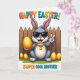Designed with a cool, human-like rabbit front and center, this card shows soft gray fur, a white belly, and pink touches inside the tall ears and on the nose 🐰. Dark sunglasses cover its eyes, yet the slight tilt of its smile and relaxed pose suggest a friendly, affectionate confidence. A chunky gold chain with a shiny medallion rests on its chest as it hugs a large golden egg in one hand and raises a peace sign with the other 🐇. The rabbit stands on green grass where several smaller golden eggs are scattered, like a shared hunt between close companions. Behind it, a rustic wooden fence in warm brown tones adds a cozy, outdoorsy setting against a white backdrop. Across the top, “HAPPY EASTER!” appears in thick, rounded letters shaded in pink, teal, and orange, and near the bottom “SUPER COOL BROTHER” is set in matching, colorful text. The golden eggs gleam with bright highlights, and the fence slats show subtle wood grain lines.