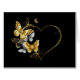 Dourada estrutura em forma de coração, decorada com ouro, joias e borboletas brancas sobre fundo preto.