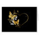 Dourada estrutura em forma de coração, decorada com ouro, joias e borboletas brancas sobre fundo preto.
