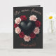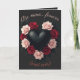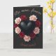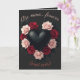 Um coração preto perfeitamente centralizado domina o centro da composição. Enquadrando o coração há uma grinalda de rosas. As flores alternam entre um carmesim profundo e um delicado rosa rosado. Folhas verde-carvão adicionam contraste e uma pitada ligeiramente gótica.