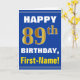 As características deste design aniversário-temáticos simples do cartão um desejo morno do aniversário gostam "do 89th ANIVERSÁRIO FELIZ, nome!" na parte dianteira, no texto corajoso em um azul coloriu o fundo. O número do aniversário tem o falso/imitação ouro-como a aparência da coloração. O nome na parte dianteira pode ser personalizado. As características internas uma mensagem do aniversário que possa ser personalizada. Um cartão como este poderia ser uma maneira do divertimento de entregar desejos do aniversário a alguém que está comemorando seu nono aniversário oitenta. [~Z0000278]