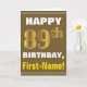 As características deste design aniversário-temáticos simples do cartão um desejo morno do aniversário gostam "do 89th ANIVERSÁRIO FELIZ, nome!" na parte dianteira, no texto corajoso em um fundo de cor castanha. O número do aniversário tem o falso/imitação ouro-como o olhar da coloração. O nome na parte dianteira pode ser personalizado. As características internas uma mensagem do aniversário que possa ser personalizada. Um cartão como este poderia ser uma maneira do divertimento de entregar desejos do aniversário a alguém que está comemorando seu nono aniversário oitenta. [~Z0000281]