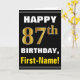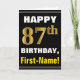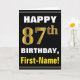 As características deste design aniversário-temáticos simples do cartão um desejo morno do aniversário gostam "do 87th ANIVERSÁRIO FELIZ, nome!" na parte dianteira, no texto corajoso em um preto coloriu o fundo. O número do aniversário tem o falso/imitação ouro-como a aparência da coloração. O nome na parte dianteira pode ser personalizado. As características internas uma mensagem customizável do aniversário. Um cartão como este poderia ser uma maneira do divertimento de entregar desejos do aniversário a alguém que está comemorando seu aniversário do sétimo oitenta. [~Z0000275]