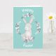 Um adorável coelhinho cinza senta-se dentro de uma coroa floral rosa, branca e verde na frente deste cartão de Páscoa. O texto Feliz Páscoa está em branco no topo e na parte inferior. A imagem e o texto estão colocados sobre um fundo azul claro de primavera. O interior do cartão tem seu texto personalizado na mesma cor azul claro, e outra imagem do coelho com um carrinho de flores.