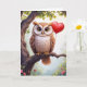 Uma coruja fofa com grandes olhos expressivos se choca sobre um galho de árvore segurando um balão vermelho em forma de coração. O texto pode ser alterado.