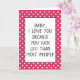 Cartão de saudação bonito com uma citação engraçada para o amor de sua vida, marido ou esposa, menino ou namorada, ou mesmo sua mãe ou pai, em um fundo de bolinhas cor-de-rosa e branca. Com a opção de personalizar com nome, palavra ou texto (limitado) de sua escolha. Deixe que aqueles com senso de humor saibam que você os ama até a lua e de volta com este sarcástico e humorístico 'EU TE AMO PORQUE VOCÊ SUCA MENOS DO QUE A MAIORIA DAS OUTRAS citações PESSOAS.