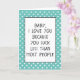 Cartão de saudação bonito com uma citação engraçada para o amor de sua vida, marido ou esposa, menino ou namorada, ou mesmo sua mãe ou pai, em um fundo azul claro verde-claro e bolinhas branco. Com a opção de personalizar com nome, palavra ou texto (limitado) de sua escolha. Deixe que aqueles com senso de humor saibam que você os ama até a lua e de volta com este sarcástico e humorístico 'EU TE AMO PORQUE VOCÊ SUCA MENOS DO QUE A MAIORIA DAS OUTRAS citações PESSOAS.