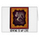 Fotografia real de uma mulher vitoriana duro no trabalho na sua máquina de costura 'de última geração', juntamente com um logótipo personalizado divertido: Sewing é My life!