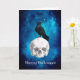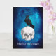 O design apresenta um corvo no topo de uma caveira assustadora branca e um belo céu noturno estrelado sombreado de azul brilhante . Dentro do cartão - Morcego assustador voando em um belo céu noturno estrelado azul . Personalize com sua própria mensagem ou exclua o texto se desejar deixá-lo em branco ( para mensagem manuscrita)