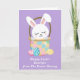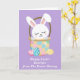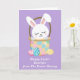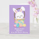 Personalize este cartão coelhinho de Felz pascoa bonitinho com o seu próprio texto personalizado com o nome dos seus filhos em branco. Este adorável coelho senta-se numa bonito cesta de Páscoa com um belo cartão roxo.