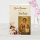 Um belo ouro e um ícone ortodoxo vermelho profundo do Cristo de Jesus segurando os Evangelhos com belos cartões de aniversário cristãos ortodoxos de rosas vermelhas e rosas claro. Uma maneira maravilhosa e abençoada de desejar à pessoa em sua vida um feliz aniversário. Personalizar com todos os detalhes e preferências pessoais.